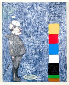 With titles such as, “No Bell Prys for Peace with Predator Drone,” “Abstraction Interrupted by leaky Wicks,” and “The Easter Eye Lands,” his playful sensibility and sense of humor contribute to his unique ability to confront complicated and multi-faceted components of politics, art, and the human condition in accessible and multi-layered ways.