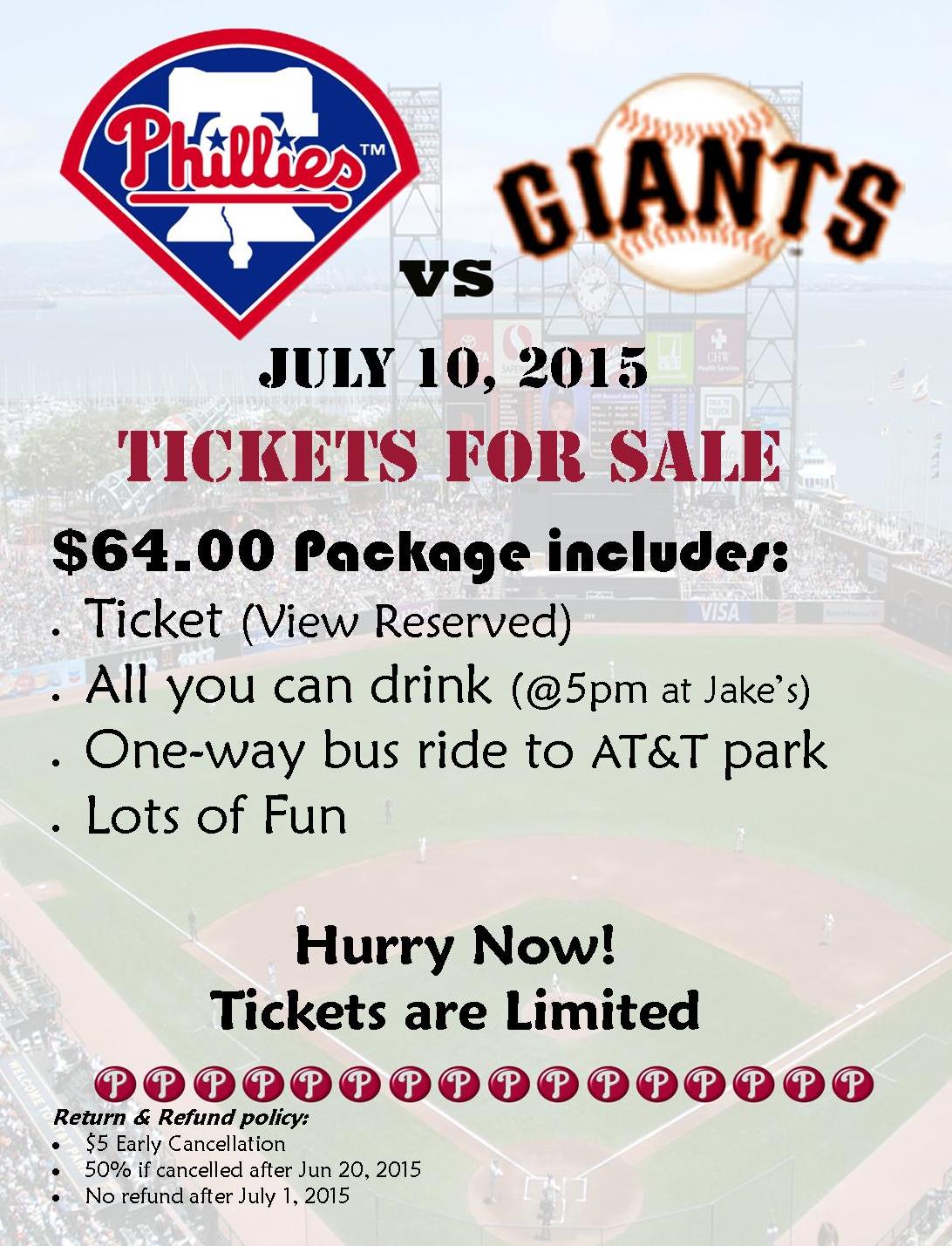 “The Phillies are in town on Friday 7/10/15 for games against the Giants. We are going to TAILGATE!”The trip includes, all you can drink tailgate at Jake's Steaks, one-way bus ride, game tickets, and lots and lots of fun!!!! We'll have 60 people in total! Put your Phillies gears on and join us. See details below. You can pay with PAYPAL by clicking the PAYPAL link at the bottom. You can also swing by at Jake's Steaks to pay for your ticket or call 415-335-3510 to pay over the phone. (Receipt and confirmation will be sent via email, tickets distributed on bus on gameday).