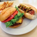 We stopped by after the Friday dinner rush and had them load up two burgers: a turkey on wheat ($6.29) with pepper jack ($0.79), avocado ($0.99), bacon ($0.99) and a whole host of free toppings (say it with me—fried onion strings!); and a double on wheat ($6.69) with cheddar, avocado, bacon and more free toppings. We skipped their salads and got french fries ($2.69) and sweet potato fries ($2.99) along with a vanilla shake and a Reese’s PB Cups shake ($3.49 each).
