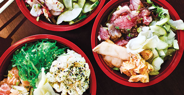 Aloha Fresh has only three options for its poke bowls: one scoop ($10.75), two scoops ($13.75) or a “surf ’n’ turf” option with one scoop of poke and a hot food item ($14.50). The bowls come with a base of rice or salad and two sides, such as crab salad, pickled onions or housemade kimchi.