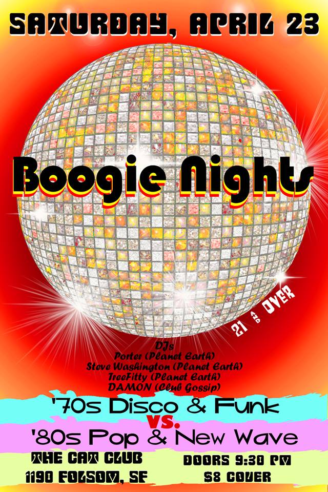 Boogie Nights Is Back in April!Returning to the Cat Club in San Francisco on Saturday, April 23rd, its the fourth Boogie Nights of 2016...Come join us for San Francisco's Disco .vs. New Wave dance party!