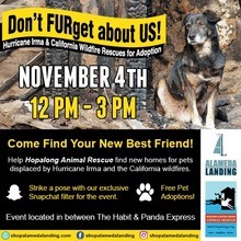 WHAT: A recent article written in The Washington Post stated that thousands of pets have been displaced from their owners due to the recent hurricanes, and are in need of new homes. In California, the numbers are similar due to the wildfires. Alameda Landing has teamed up with Hopalong Animal Rescue to help pets made homeless by Hurricane Irma and the California Wildfires find new forever homes. The center and Hopalong Animal Rescue will host a FREE “Don’t FURget About Us” pet adoption event, and Alameda Landing will pay the adoption fees. In addition, when customers make a donation to Hopalong Animal Rescue or show a receipt from any Alameda Landing stores or restaurants, they will receive a FREE Walk with Your Pet Flashlight with poopie bag holder. Hopalong Animal Rescue is also accepting donations including litter boxes, puppy food, dry kitten food, travel crates, cat and dog collars and pet toys. For more information about volunteering or donating, please click HERE.All animals up for adoption come vaccinated and chipped, spayed and neutered. The event will also feature a pet play area so people can play with the animal and get to know them before adopting and booths by family-committed pet store, See Spot Run, and Happy Hound, a training, boarding and pet spa.