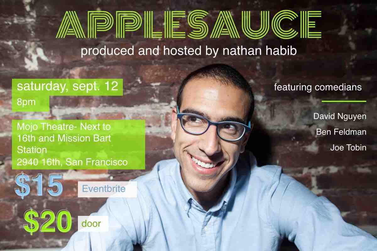 Applesauce is a monthly live stand up comedy show hosted by an established Bay Area comedian, Nathan Habib. The show features the brightest local talents as well nationwide visiting comics who appear on NBC, Comedy Central, and TBS.Just one block from the 16th and Mission Bart station, come enjoy a night of laughter from acclaimed talent without irritating drink minimums in the most intimate fashion.