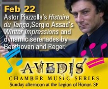 The February 22nd concert highlights two pieces with Latin American influence –Astor Piazzolla's brilliant Histoire du Tango and Winter Impressions by