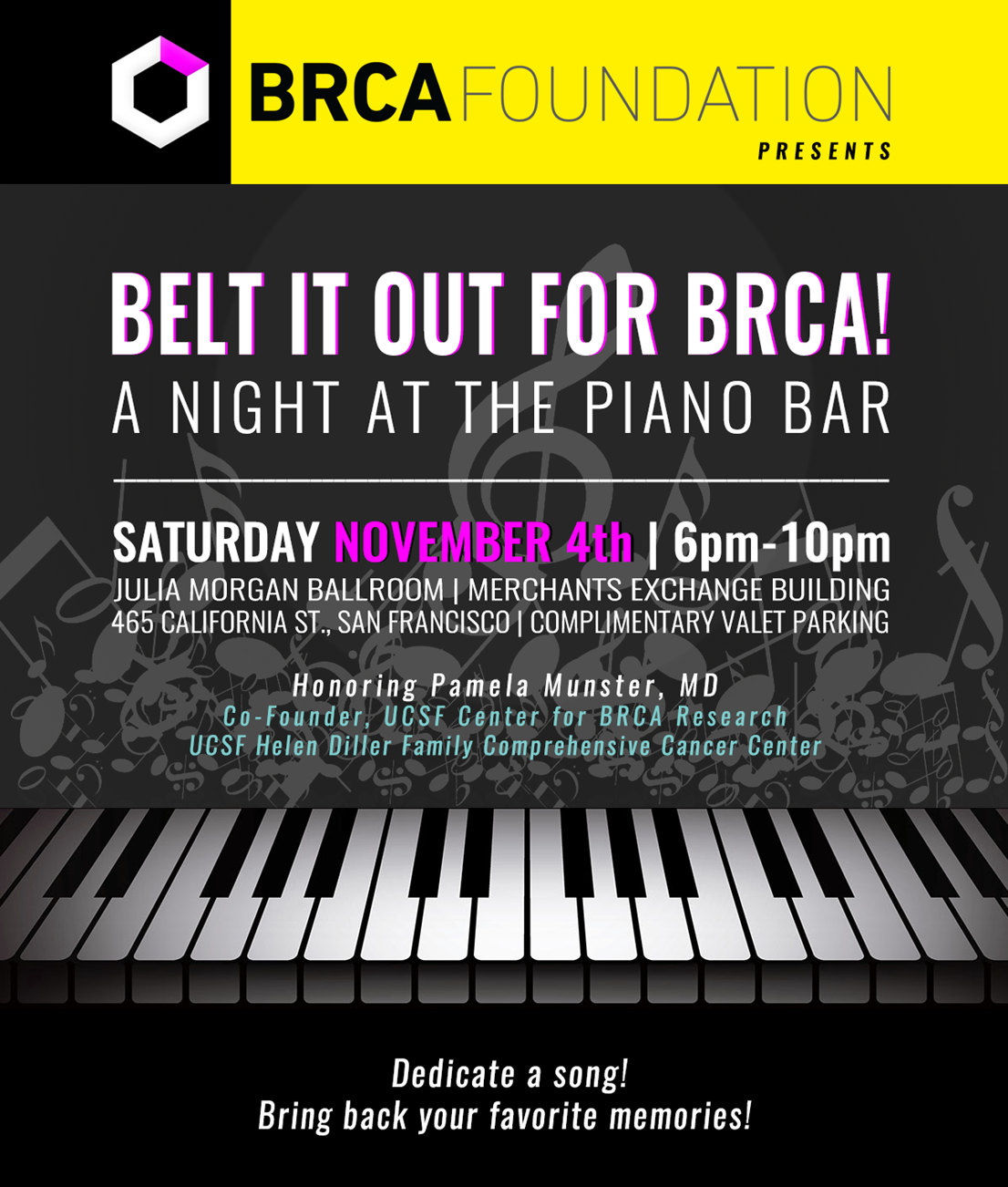 WHAT: The BRCA Foundation presents its inaugural San Francisco fundraiser, Belt It Out For BRCA! A Night at the Piano Bar. The evening will include an elegant dinner, dueling pianists, live auction items, mystery boxes and more! Guests are invited to sing along to classic songs. Dr. Pamela Munster, MD, and co-founder of the UCSF Center for BRCA Research will be honored.WHEN: Saturday, November 4, 2017