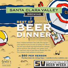Scott's Seafood in Downtown San Jose has partnered with Santa Clara Valley Brewing Company to celebrate Silicon Valley Beer Week. Join us on Monday, July 24th, 2017 at 6 pm on the rooftop patio for "The Best Of Summer" Beer Dinner. Our selected five courses compliment Santa Clara Valley Brewing Company's award winning beers. This summer sizzling celebration will be an experience to remember.Best Of Summer Beer Dinner Pairing Menu: