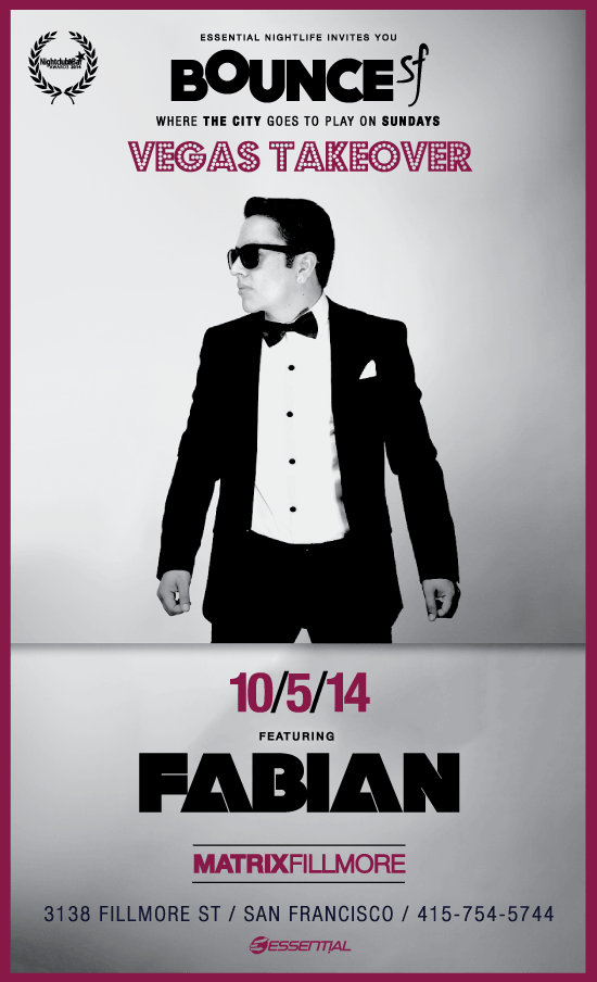 Bounce Sundays at Matrix Fillmore is set for another fun night for the “Vegas Takeover” edition, Sunday October 5th.As the entertainment capital of the world, Vegas has become renowned for delivering the best in nightlife entertainment. This has held especially true for renowned nightclubs XS and Tryst, who feature the worlds most legendary DJ’s on a nightly basis. Well, for our next edition of ‘Viva Las Vegas’ we’re going to transcend this experience right here in San Francisco by hosting resident DJ at these two famed clubs, DJ Fabian.