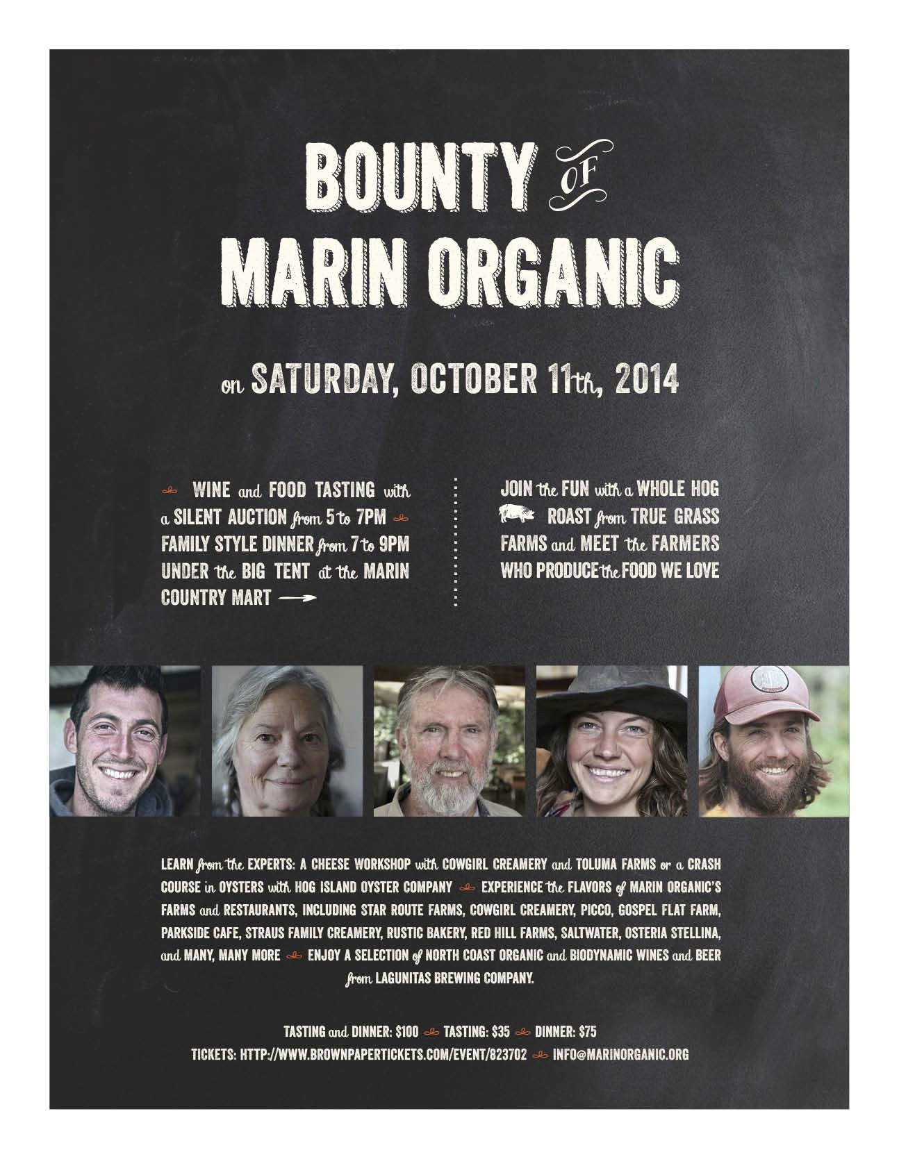Marin Country Mart is pleased to host a special fundraiser to benefit Marin Organic, whose mission is to promote organic agriculture in Marin and beyond. The harvest festival, “Bounty of Marin Organic,” will be held on October 11 from 5 - 9 pm in Marin Country Mart’s Big Tent. Celebrating the bounty of local farms, the event invites adults and families to join the fun, savor food and wine from the region, and meet the farmers who feed us and produce the food we love. The festival features farmers who share the produce they have been cultivating all summer and local chefs who join them to showcase their creativity.Five different options are available for guests to taste and enjoy, ranging in price from $25 – 100. From 5 – 7 pm, wine and food tastings feature delicious bites and sips, including cheese, oysters, meatballs, olive oil – and ice cream for kids of all ages from Straus Family Creamery. Two workshops welcome guests eager to learn more – one on cheese by Cowgirl Creamery and Toluma Farms, the other on oysters from Hog Island Oyster Bar. A number of silent auction items sure to tempt bidders include special experiences for dining, lodging, adventure and desirable services.