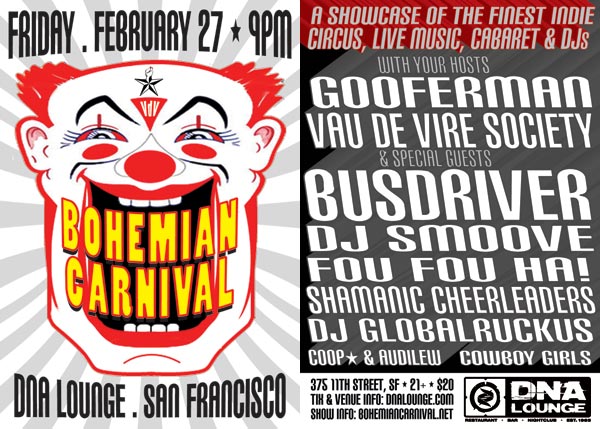 "Astounding talents, beautiful beauties, inevitable and incessant circus, live music, DJ and dancing action!Gush with gumptionly glee as your evening's hosts Vau de Vire Society and Gooferman meld mettle with their bare hands -- sirens of circus and kings of klown-fi united in a truly naughty, bombastic maraud!" -DNA Lounge