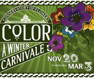 A dazzling display of floral color at San Francisco's Conservatory of Flowers treats visitors to one of the greatest shows on earth.If the gray days of winter give you the blues, make your way over to the Conservatory of Flowers for a breathtaking blast of vibrant color and beauty in "Color: A Winter Carnivale", a new exhibition on view November 20 through March 3. It's a spectacular spectacular with more color than most gardens display in mid-summer. Hundreds of plants are arranged in color clusters of red, blue, purple, orange, yellow, green and silver/white, creating a living rainbow of bright blooms and luminous leaves. Whimsical design elements such as jeweled pendants, lanterns and mobiles lend the display a dazzling turn-of-the-century world's fair atmosphere. Children will love the Wheel of Flora-tune, a casino-quality big spin that sends them on a hunt for color clues. Fun facts appear throughout the exhibition to help visitors understand the role that colors play in botanical strategies of survival.
