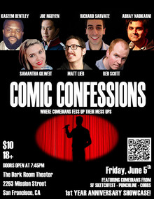 Comic Confessions turns One Year this on June 5th!Comic Confessions- where comedians fess up their mess ups is a showcase featuring some of the funniest comics in the Bay Area. Comics hide one confession in their act and at the end of the show, the audience has to match a Comic's Confession with a Comic's set. The winners get prizes and free tickets for future shows.
