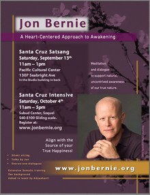 Awakening is completely natural, a force of nature--like gravity, like birth. Awakening is continuous and ongoing, and as it progresses, there's a natural trust that evolves, a natural support, and gradually we find that vulnerability and letting go are not so threatening anymore. Join Jon for a day of discovery, as we learn to relax and allow this natural force to transform our lives, experience and relationships.This day-long intensive will feature periods of silent sitting and several sessions of satsang, as well as silent breaks for contemplation and unstructured free time for connecting with other attendees.