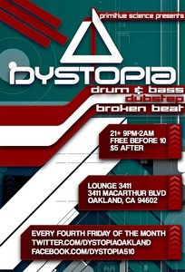 Dystopia is every fourth Friday of the month hosted by Primitive Science. Come get 'baptized' to the sounds of Drum & Bass champions from all over the sprawl and indoctrinated by the verses of our MC's!