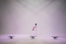 A high-tech dance show with illuminated drones, projected multimedia, and 3D objects.