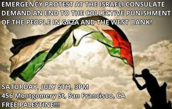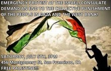 Since June 12, in actions denounced by human rights groups worldwide, Israel has been engaged in a practice of collective punishment against the Palestinian people. Eleven Palestinians have died, thousands of homes have been raided, more than 600 Palestinians have been detained, and over 100 airstrikes have pummeled Gaza.Concerned Bay Area residents will gather at the Israeli consulate on Saturday to demand an end to Israel’s collective punishment in the occupied West Bank and Gaza Strip.