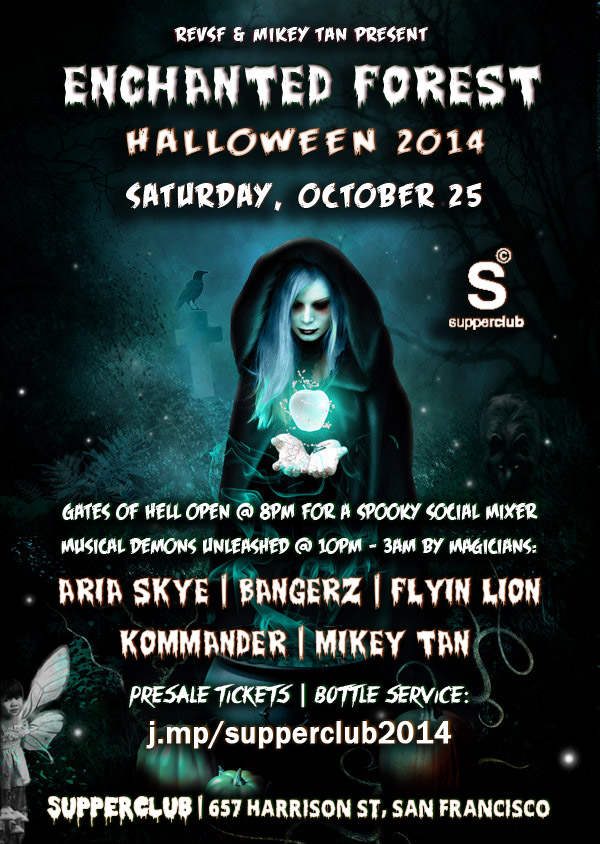 Join us this Saturday, October 25, 2014 for Bay Area’s premier INTERNATIONAL HALLOWEEN party where we turn the posh Supperclub of San Francisco into a spooky ENCHANTED FOREST full of fairies, witches, wolves, ghosts, goblins and other deep forest inhabitants roaming around! Be enchanted by the unique theme, amazing decorations and extravagant costumes, character performances and great music! It’s time to put on your sexy costume and come to Supperclub this Saturday for our epic annual Halloween party!