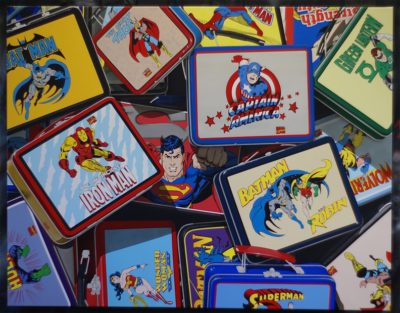 The bar is set high with a classic 1962 portrait of Captain Midnight by one of the masters of Pop, Mel Ramos. Other artists include Sharon Moody, exhibiting one of her signature trompe l'oeil comic book paintings, and Peter and Madeline Powell, who utilize iconic consumer imagery in their paintings of superhero-lunchboxes. Martin DiGirolamo and Cheryl Kelley have both created works especially for the show: DiGirolamo presents a strong and sexy Wonder Woman sculpture, and Kelley, known for painting glossy muscle cars, gives us the most macho car of them all: the Batmobile.