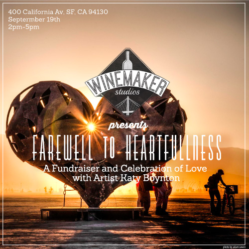 Come join us at Winemaker Studios as we say farewell to Heartfullness. This iconic piece that we have grown to love in our space is making a journey to its new home in Fremont, CA. Meet artist and creator Katy Boynton and her crew as they return from Burning Man, and let's keep the energy and love going! Food will be available for purchase.