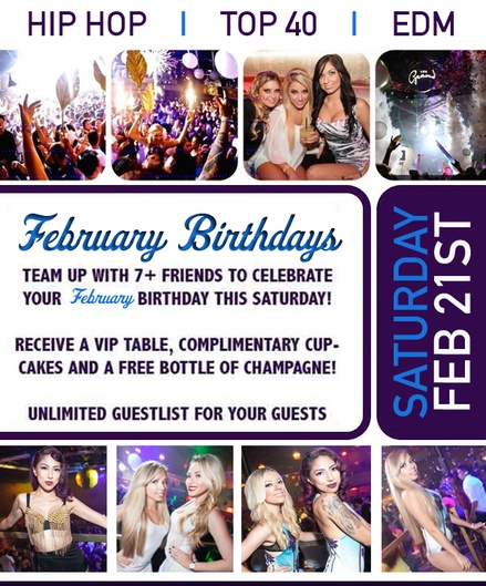 Celebrate your February Birthday this Saturday night with 7+ friends and receive a complimentary VIP table and a complimentary bottle of bubbles on us!Join us at The Grand Nightclub this Saturday for a night of Hip Hop, Top 40s and a little EDM music! Go from throwing your hands in the air to fist pumping all night long! Please be sure to call or text (415) 636-0029 to reserve your February Birthday Package!