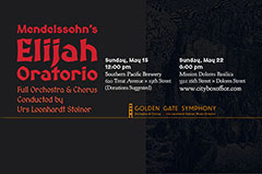 Urs Leonhardt Steiner and the Golden Gate Symphony Orchestra & Chorus will perform Felix Mendelssohn’s monumental work, the oratorio Elijah. Influenced by Bach’s St. Matthew’s Passion and oratorios by Handel, this work is based on the biblical story of the profit Elijah, and has been sung in English since its premiere, making it one of the more accessible choral works in the classical repertoire. Rarely presented due to its large scale, the GGSOC offers a unique opportunity for Bay Area audiences to hear Elijah performed with full chorus and orchestra.Soloists: