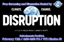 Join RE-volv for a free screening of DISRUPTION on Thursday, February 12th. Snacks and drinks are provided. Stick around after the screening to discuss the film, climate change, and what you can do to push the movement for climate solutions forward.Register at http://disruption1.eventbrite.com