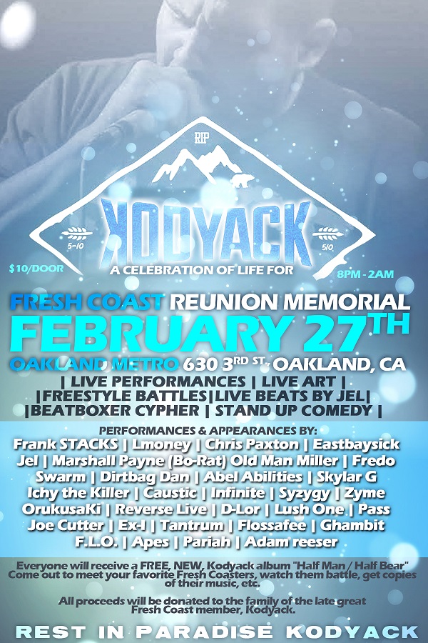On December 30, 2015 KODYACK, a bay area hip hop legend in the battle rap scene, passed away unexpectedly, just days after a tragic fire claimed his family home on Christmas morning. Some of the finest rappers, producers, battle rappers, beatboxers and comedians have banded together with Tourettes without Regrets host Jamie DeWolf to raise money for KODYACK's family to help rebuild their home. ALL GUESTS WILL RECEIVE a FREE COPY of an EXCLUSIVE COLLECTION of KODYACK's remastered work. JOIN US as we CELEBRATE the LIFE and MUSIC of Fresh Coast member KODYACK, HALF MAN/HALF BEAR. It's gonna be a FRESH COAST REUNION that YOU DON'T WANT TO MISS. IT'S GONNA BE OFF THE HOOK.