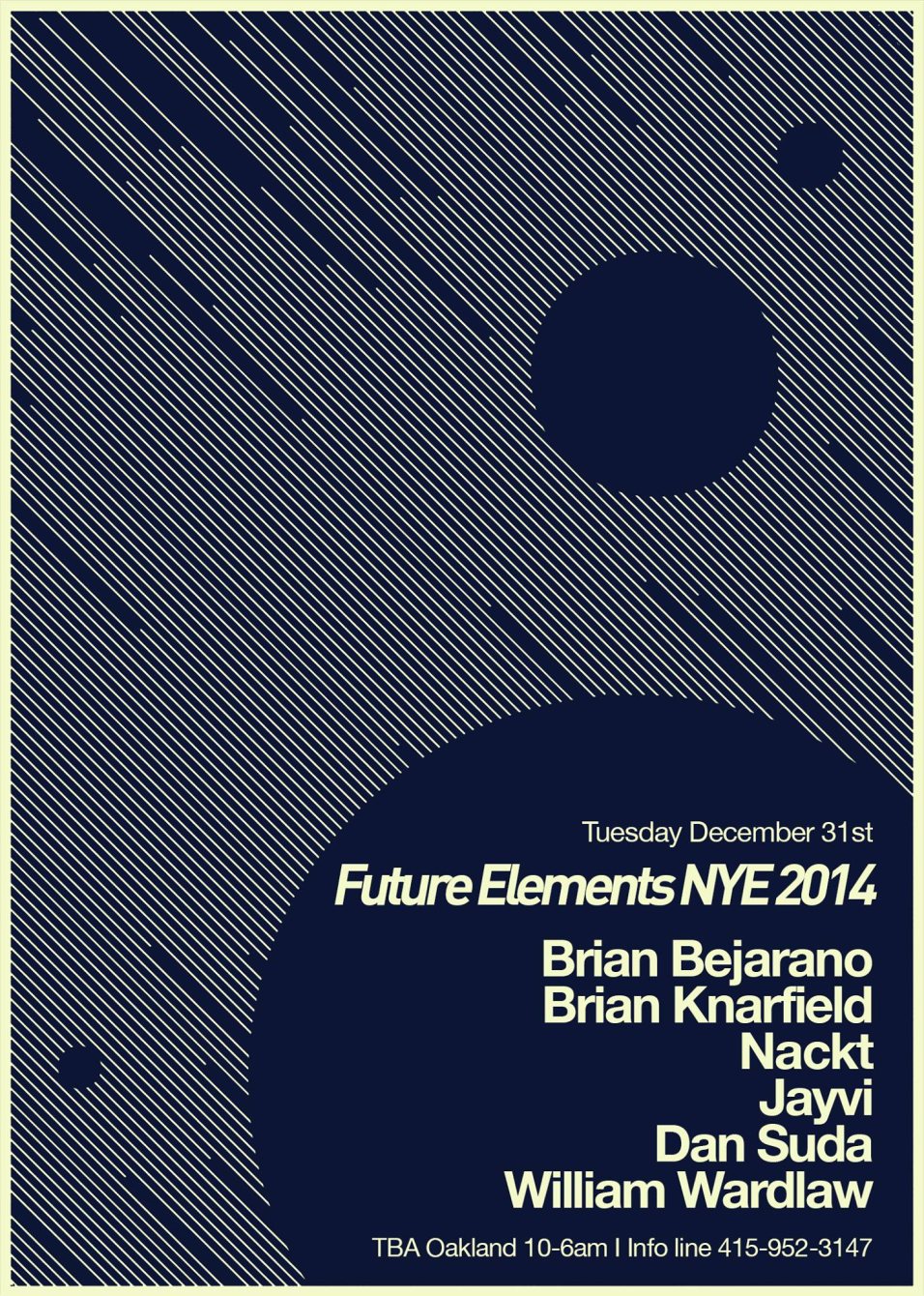 It's been a few years, but Elements is Back! We couldn't think of a better way to reconnect with all our friends than to throw a proper underground on New Years Eve! This party has a stacked local lineup, phat RCF sound, custom lighting & visuals, and is located in a secure underground venue in Oakland. There will be a food vendor in the chill area in case you might need a bite to get ya through the night. Come ring in the New Year with us.$10-15 pre-sales