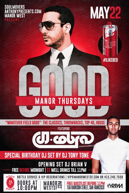 GOOD Manor Thursdays is back this week with special guest DJ Cobra spinning Classics, Top 40, House, and whatever feels good! Join us at the City’s best new Thursday party serving up 2 for 1 drinks and featuring sexy Go-Go’s, the City’s best sound system, and other surprises! RSVP on the Guest List for FREE entry before 11pm.DJ Cobra