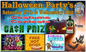 Halloween parties Sat. Oct 27 and Wed. Oct 31Band on Oct. 27 is Superbad