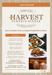 Celebrating the abundance of the outstanding farms and breweries on the San Mateo County coast, the Half Moon Bay Brewing Company is excited to announce their inaugural Harvest Pumpkin Dinner on October 7. This four-course feast, prepared by Chef Alfaro, includes pumpkin in every course paired in palate-pleasing harmony with different pumpkin beers. Head Brewer Shane Aldrich and Brewmaster James Costa will unveil their brand new Imperial Pumpkin Ale at this special dinner, alongside their annual Mavericks Pumpkin Harvest Ale and other special autumn-inspired brews from San Francisco's Almanac Beer Company and 21st Amendment. (Reservations required as space is limited); tickets are available for purchase at http://hmbbrewingco.inticketing.com/events/435472/all-things-pumpkin-harvest-dinner/. Vegetarian options are also available and those with questions may call 650-728-2739.)More Info