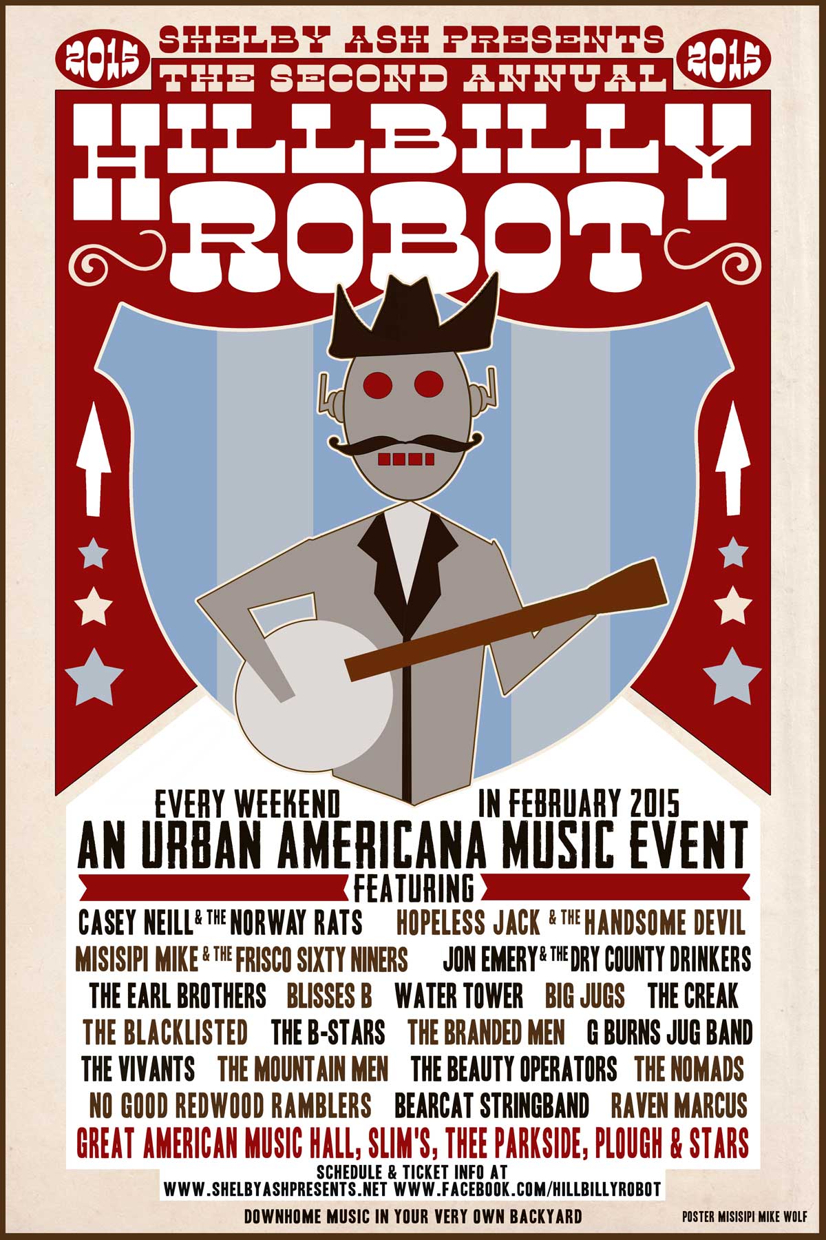 HiLLBiLLY ROBOT returns for round two! The festival, we mean event, runs every weekend in February and features a variety of urban-flavored Americana; from classic country to alt-country to traditional bluegrass to outlaw bluegrass to raw-n-roll blues to indie-pop with hints of twang. This year's event welcomes the return of "Portland Invasion" (yeah!) and new show "Songs of '69: a Tribute to an Amazing Year in Music", plus popular festival mainstays; "Honky-Tonk Showdown", "Bluegrass Bonanza", "Americana Jukebox", and a CD release show! No matter what your listening pallet may be (city or country) we've got a little something for everyone. So break out your bestest overalls, spit-shine your boots, and head on down to Hillbilly Robot for some good old-fashioned downhome music.Direct from the streets of Portlandia, comes "Portland Invasion". Originally created for the now defunct SF Bluegrass & Old-Time Festival, "Portland Invasion" returns with a vengeance and features our most eclectic and electric Americana music show yet. Over the last 10 years "Portland Invasion" has become a must see event and now with the invention of electricity- this powerhouse of a show is even more of a not to be missed event during Hillbilly Robot.