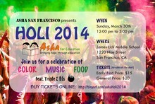 Asha San Francisco presents the event you've all been waiting for: HOLI 2014 on Sunday, March 30, from 12 pm to 3pm (http://www.ashanet.org/sf/events/holi/2014)Tickets are sold ONLINE ONLY (no sales at the door)