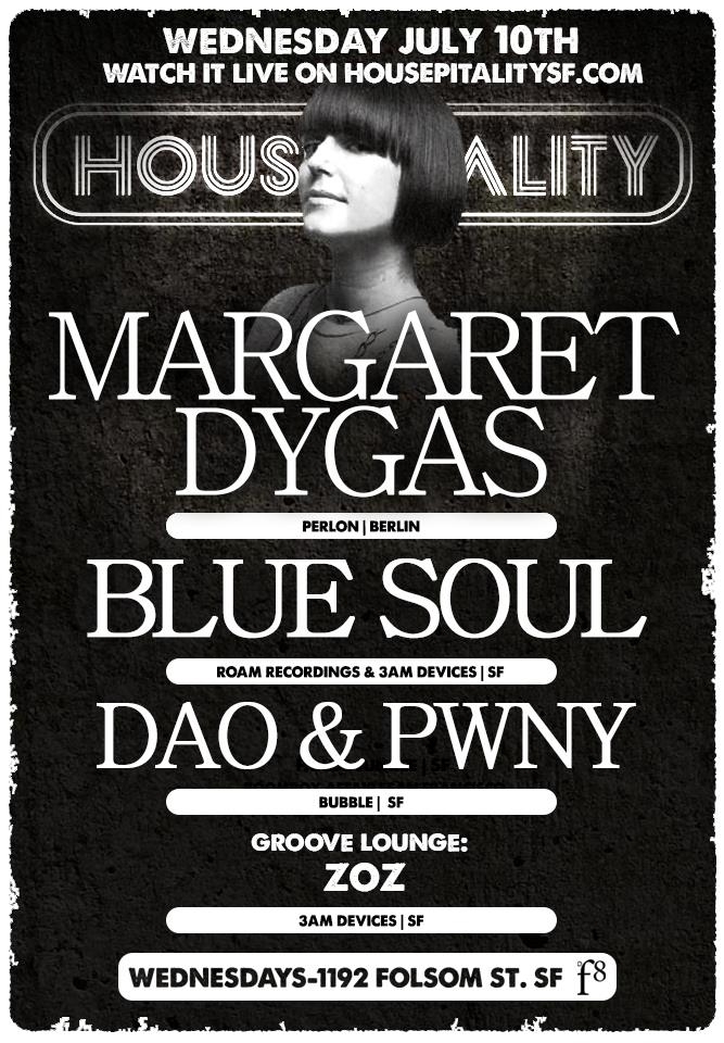 ( ( ( ( (H O U S E P I T A L I T Y) ) ) ) ) proudly presents a return appearance from an inimitable lady of the decks, and supporting sets from some of our most talented locals, with:::MARGARET DYGAS (Perlon | Berlin)::