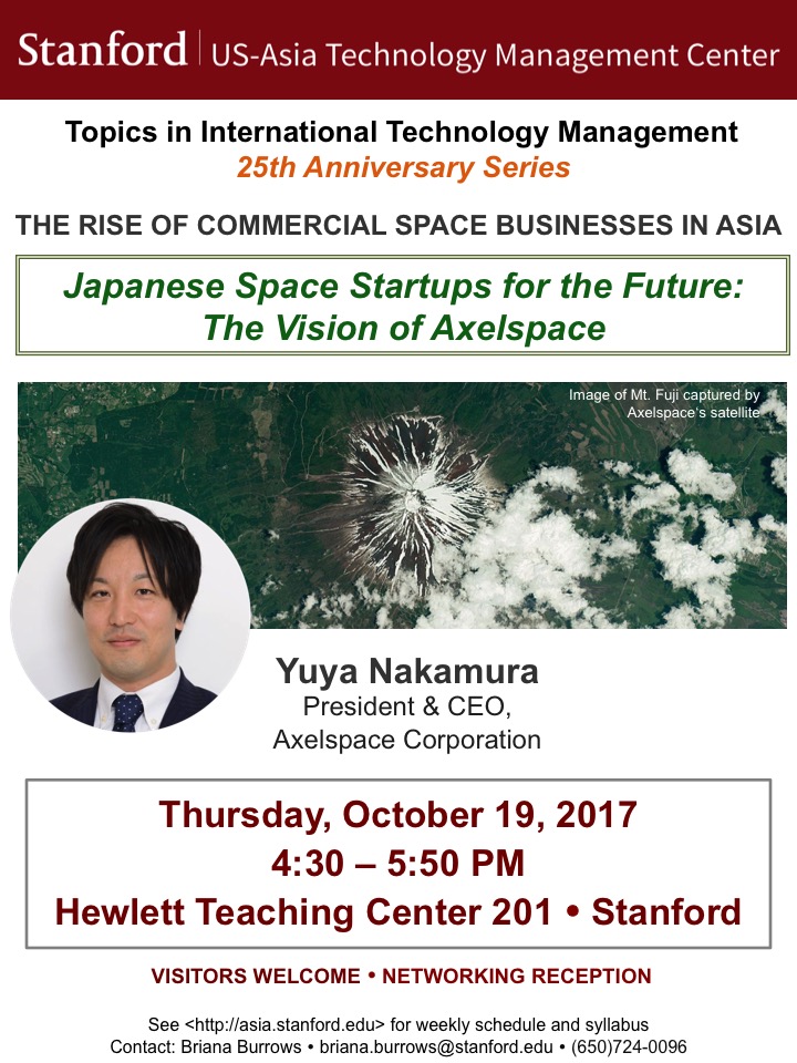 Axelspace is a startup company developing businesses in the microsatellite field. Axelspace plans to construct a monitoring platform to cover the entire globe on a daily basis at extremely low cost. Do come on Thursday to find out, from the President and CEO himself, more about the company's vision for the future.