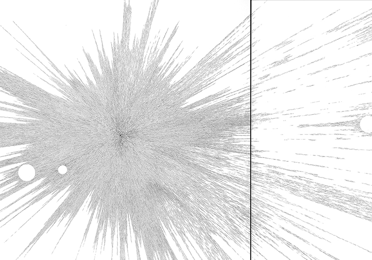 All of the works are visually highly expressive, as the markings erupt from a central source of energy, and, occasionally, from multiple nuclei scattered across the clayboard’s matte surface. While previous works exhibit an ardent solidity of form, newer works, such Flashpoint (2014) and Vanishing Point (2014), introduce moments of pause—manifested as empty space—that disrupt the centrifugal motion. Intersection (2014) pushes this aesthetic even farther by galvanizing a different type of energy altogether. Within the bounds of a circular shape, lines ping pong back and forth between the form’s circumference, occasionally dematerializing when they intersect vacuums of what can be thought of as “paused time,” which also manifest as circular forms. Interestingly, it is the negative space of the converging lines themselves that gives these moments their shape. “Surrounded by such speed and violence,” Kent explains, alluding in part to today’s hyper-technological, fast-moving world, “these drawings are my way to slow it all down and see things a mark at a time.”