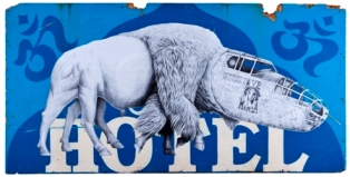 Hazelip has both street artist “cred” as well as a BFA from the prestigious Art Center College of Design in Pasadena. His large-scale murals on boarded up buildings in the East Bay are much admired until they are summarily painted over by graffiti abatement squads. Of late, Hazelip has no trouble finding authorized venues for his work, such as the SFMOMA windows and Justin Giarla’s White Walls gallery in the Tenderloin. For these indoor sites he uses reclaimed materials. The found objects lead him in interesting directions such as a discarded hotel sign that serves as the base for the painting “Odin” and signifies temporary habitation.