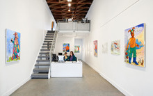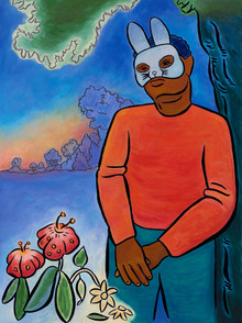 Like Dorothy in the magical Land of Oz, John Bankston’s latest protagonist, The Explorer, navigates a fantasy region he calls The Rainbow Forest. We follow this character through three episodes, watching and participating as he winds his way through the confusion and the beauty of the imagined country and its creatures. Each of the three chapters of the series is comprised of a set of drawings punctuated by a painting. In “Farewell,” the Explorer says goodbye to his friends and is off, mechanical birds and butterflies accompanying him as he follows the path. “The Encounter” finds the Explorer surprised by a group of small men wearing animal masks. Initially welcomed and draped with flower garlands, the garlands become bindings and The Explorer becomes their captive. Leaving the viewer to interpolate the narrative between chapters, “The Cave” is the final chapter in this visual saga. One of the small men leads the Explorer to a cave and together they come upon a being emerging from the rock walls. When they leave the cave they encounter an Abstracticator. Bankston’s inspiration for this robot creature was a visit to the Sloss Furnaces in Birmingham, Alabama – a century old abandoned blast furnace.