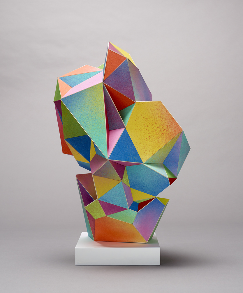 Each work is created by hand through a process of cutting and fitting paper to create sculpture. They are meditations on form created through a stream of consciousness process. He uses color in the paper pieces as a device to create perception of perfection. The eye sees the color and the form and fills in the mistakes.