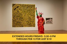Extended Hours! Fridays, Jan 16, 23, 30 and Feb 6 & 13For five Fridays, starting January 16 through February 13, see special exhibition Keith Haring: The Political Line at the de Young from 5:30 to 9 pm for just $15 when you book in advance online.* Plus, enjoy a wine and cocktail bar on the main level of the de Young before you head downstairs to enjoy the exhibition. Exuberant, profane, witty, and provocative, the works in this exhibition trace Haring's creative development and his historical significance as an advocate for social justice. Don’t miss this special opportunity to see the exhibition before it leaves San Francisco!