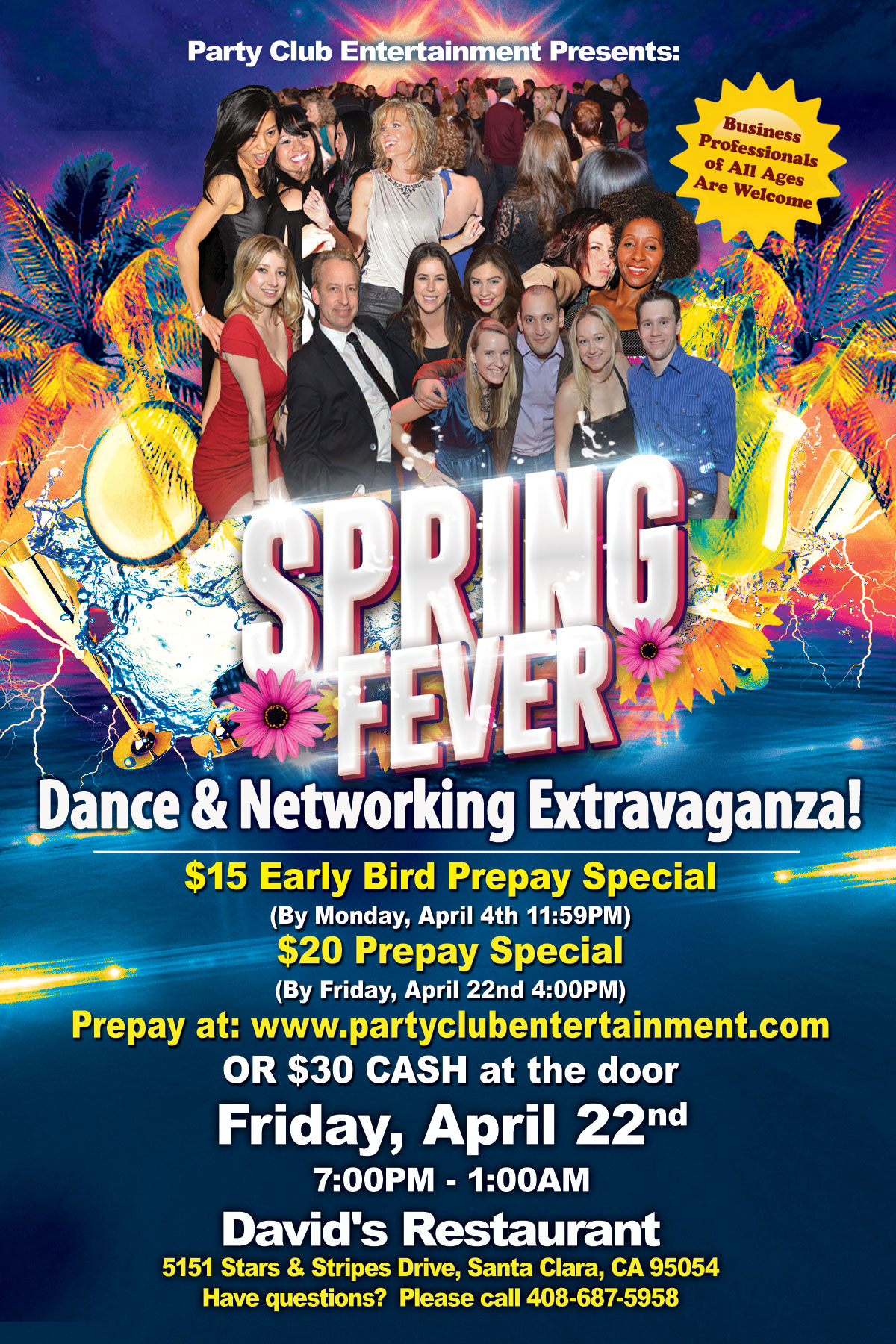 Let's Celebrate at the Biggest Spring Fever Dance And Networking Extravaganza ever on Friday, April 22nd starting at 7:00PM - 1:00AM at David's Restaurant at 5151 Stars & Stripes Dr. in Santa Clara.Our last year's Spring Fever event was the biggest ever with over 400 attending!
