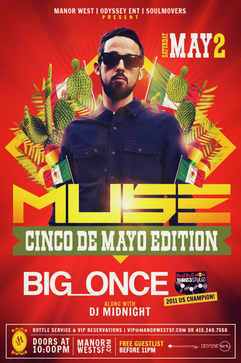 PRESENTED BY: MANOR WEST | ODYSSEY ENT | SOULMOVERSCinco De Mayo is right around the corner and we are ready to celebrate! Join us this SATURDAY while we party with 2011 RedBull Thre3style US champ, Big_Once! SF's own DJ Midnight is opening us up for a night to remember.