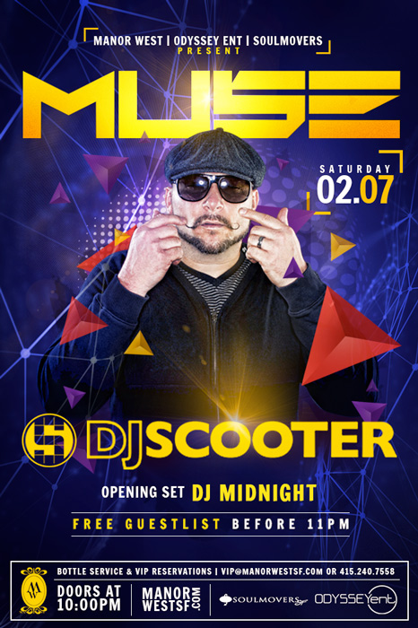 DJ Scooter is a force to be reckoned with when he steps into the booth! This versatile party starter can be found rocking parties in all of the hottest nightclubs across the US and beyond, but this weekend he's here at Manor West! DJ Midnight is here to support, so be sure to get here at 10p sharp!Comp entry before 11p with guest list sign up. Dress code strictly enforced.
