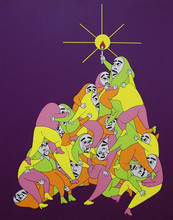 “People Eat People Too” is a solo show of paintings by Berkeley based artist Noah Ptolemy. Applying deceptively simple illustration techniques with acrylic paint and india inks, Ptolemy creates complex and crisply rendered narrative images of the human theater, full of competition and play. Each painting is a layered tableaux, populated by a multitude of Ptolemy’s signature “everyman” characters bustling about a circus-like, anthropomorphized stage. In the artist’s words, “All the characters look the same so that everyone has an equal shot”.Ptolemy spent his formative years living in Japan, and came to live in the US when he was 13 years old with minimal English skills. Ten years later, living in Detroit as a young adult in 2004, he started drawing and painting in earnest. “Set against Detroit’s crumbling neighborhoods and economy, my work quickly started incorporating elements of both isolation and hope. As someone who had a rough go with my identity when first arriving in the U.S., I felt like I could really relate to a city no one seemed to care about.” Fast forward another decade, and Ptolemy has developed a highly focused and unique storyline that runs through his work and translates his outsider’s perspective. The exhibition of “People Eat People Too” will include new works not previously exhibited by the artist.