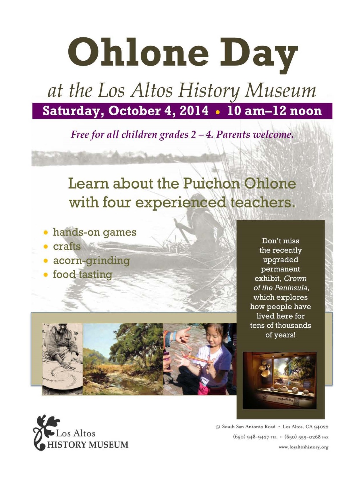 Ohlone Day returns the morning of October 4, timed nicely with “Indian Summer” celebrations in town. Four experienced educators will once again teach children about the first peoples of this area in the free 2-hour session. “Do you know the name of our local Ohlone here in Los Altos & Los Altos Hills? asks seasoned teacher and Museum docent Mary Kuperman. “They are called Puichon.” Ohlone Day ties to the school curriculum, but also makes note that descendants of our first peoples are among us today. “It’s a mistake to think they are gone,” adds volunteer Vicki Holman. “They and their culture are flourishing – it’s fascinating to explore.”
