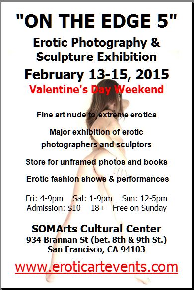 “ON THE EDGE 5” Erotic Photography and Sculpture Exhibition will feature 26 photographers and sculptors displaying erotic sculptures and hundreds of erotic photographs from fine art nude to extreme erotica. This will be a major group exhibition held again at SOMArts Cultural Center in San Francisco on Valentine's Day Weekend, February 13-15, 2015.Hours: Friday 4-9pm, Saturday 1-9pm and Sunday 12-5pm.