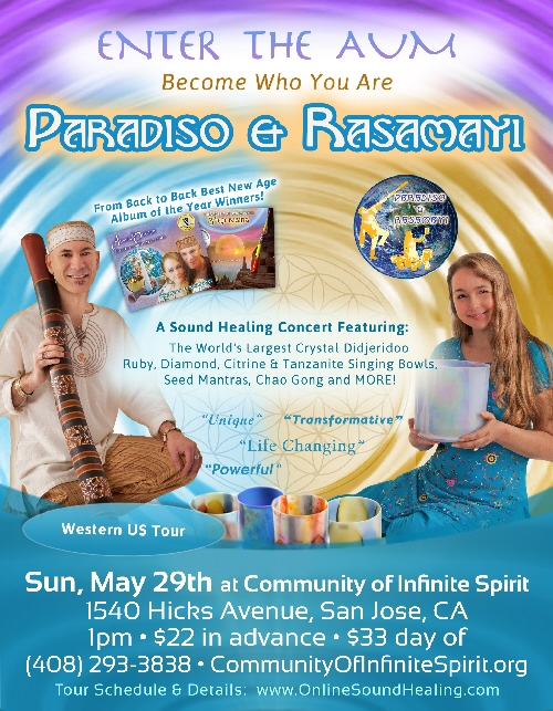 Enter the AUM - Become Who You Are! Paradiso & Rasamayi will take you on a transformative spiritual journey through sound. Experience the world's largest Crystal Didjeridoo, Ruby, Diamond, Citrine & Tanzanite Singing Bowls, Seed Mantras, Chao Gong and MORE!This is their Western US Tour from back to back best New Age Album of the Year Winners! This is the only performance for the entire Bay Area. Get your tickets now!