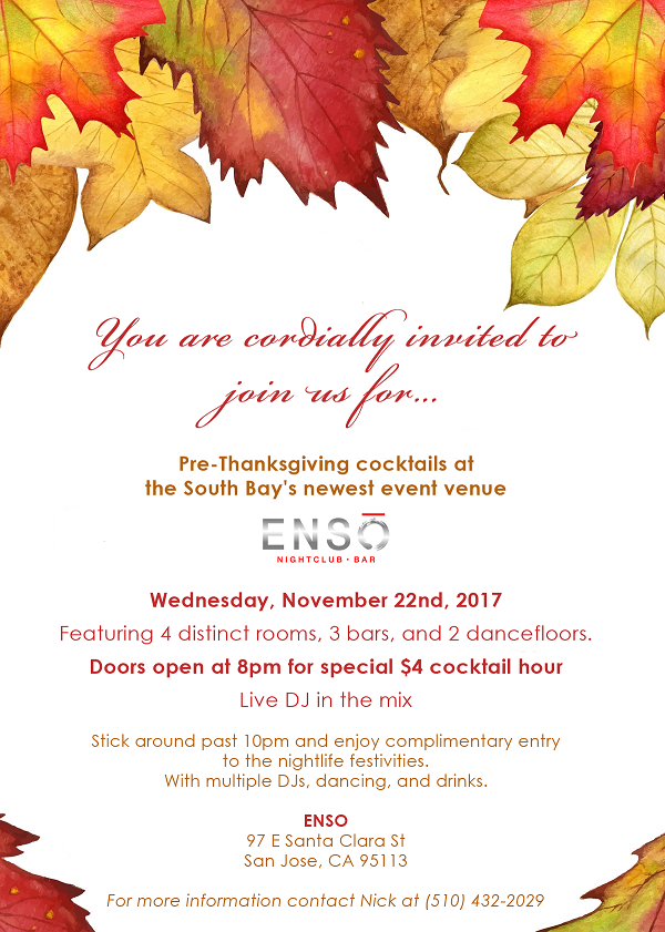 Wednesday, November 22nd, 2017You are cordially invited to join us for pre-Thanksgiving cocktails at the South Bay's newest event venue, ENSO.