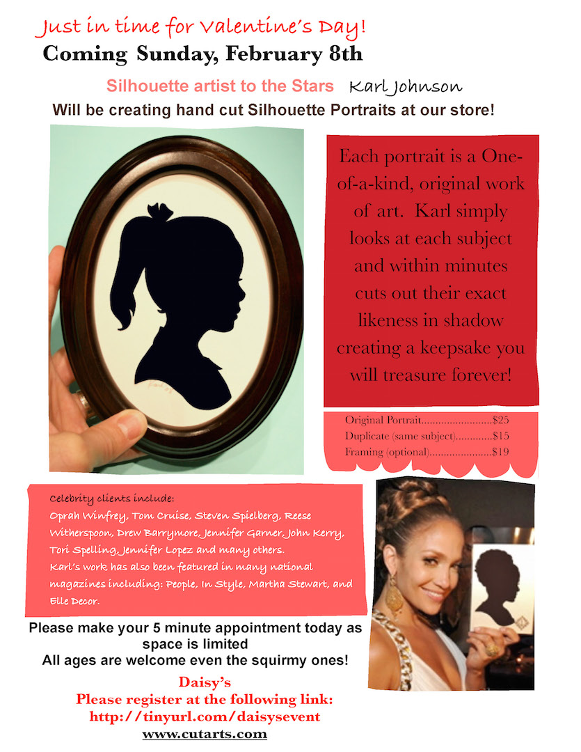 Just in time for Valentine’s Day, Third Generation Silhouette Artist Karl Johnson will be at Daisy’s on Sunday February 8th to create hand cut silhouettes. Each one is cut freehand and takes just minutes. All ages are welcome including the squirmy ones!Karl's work has been featured in over 30 magazines including The O List in Oprah Magazine, People, and Elle Decor. He also has a large celebrity following and has created silhouettes for Reese Witherspoon, Drew Barrymore, Jennifer Garner, Jennifer Lopez, Secretary of State John Kerry, Tom Cruise and many more. His artwork is also currently carried by Restoration Hardware Baby & Child and specialty children's boutiques.