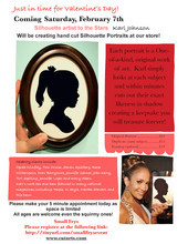 Just in time for Valentine’s Day, Third Generation Silhouette Artist Karl Johnson will be at Small Frys on Saturday February 7th to create hand cut silhouettes. Each one is cut freehand and takes just minutes. All ages are welcome including the squirmy ones!Karl's work has been featured in over 30 magazines including The O List in Oprah Magazine, People, and Elle Decor. He also has a large celebrity following and has created silhouettes for Reese Witherspoon, Drew Barrymore, Jennifer Garner, Jennifer Lopez, Secretary of State John Kerry, Tom Cruise and many more. His artwork is also currently carried by Restoration Hardware Baby & Child and specialty children's boutiques.