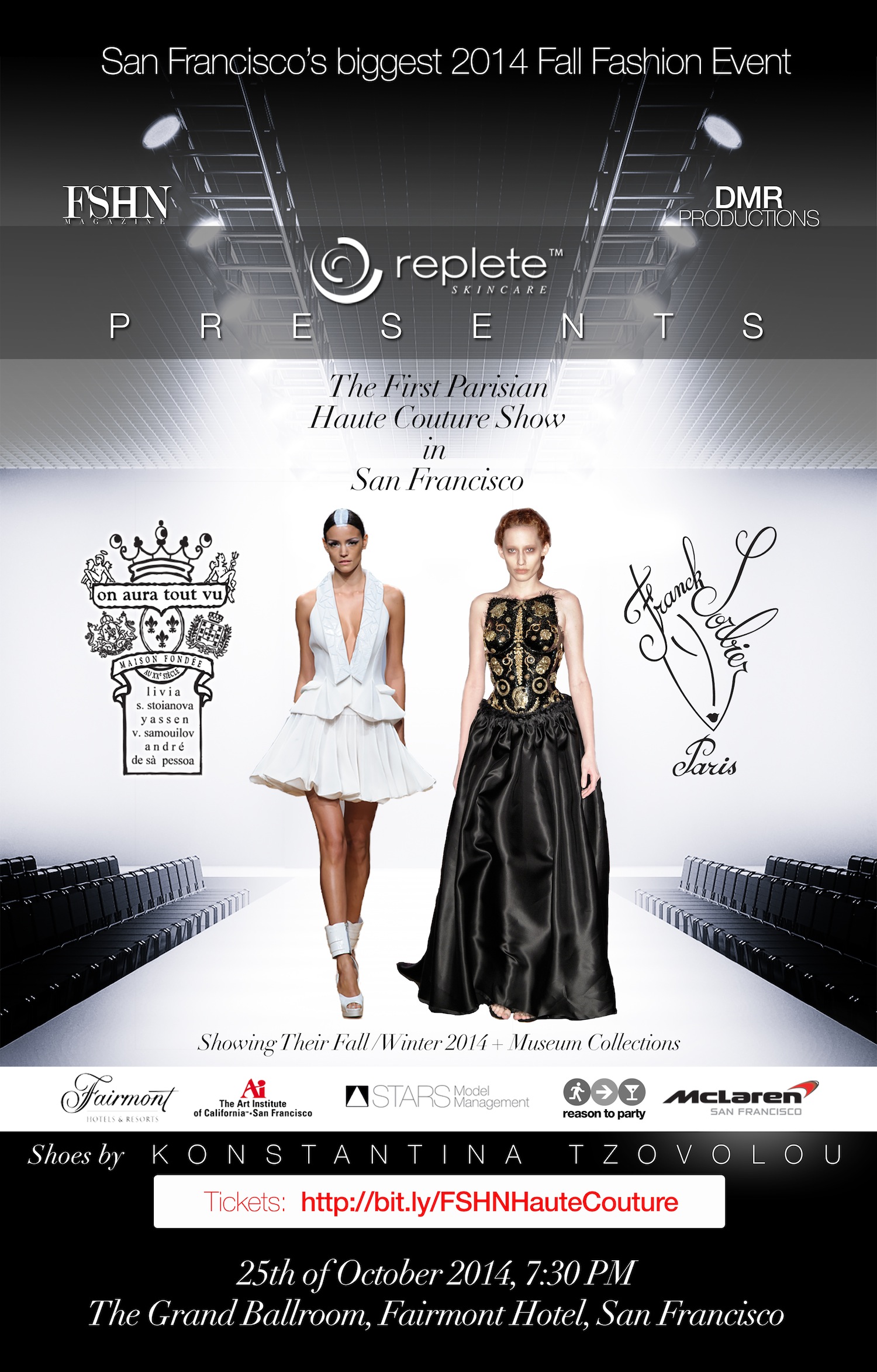 Replete Skincare, an emerging seasonal skincare line, presents the 2014 Couture Fashion Event with DMR productions and FSHN magazine on Saturday, October 25, 2014 at 7:30 pm at the Fairmont San Francisco. The 2014 Couture Fashion Event will showcase Parisian Haute Couture designers, Franck Sorbier and On Aura Tout Vu. Between the two runway shows, Replete Skincare will showcase the incredible voice of upcoming French pop singer, FRENCH. His music will be followed by a presentation of Konstantina Tzovolu’s Fall/Winter season collection of shoes and booties entitled, “The Ballad of Heels.” Replete Skincare is donating 10% of all ticket sales for the 2014 Haute Couture Fashion event to Reason to Party, an all-volunteer San Francisco 501(3)c non-profit that raises funds in fun ways for extraordinary local nonprofits. The funds are earmarked for Samasource, a nonprofit that helps connect poor women and youth to training and employment in the digital economy.Tickets are available from $175 for general admission to $600 for runway seating which includes a reception on Friday, October 24th with designers at the home of Elisabeth Theiriot. For more information and to buy tickets please visit http://www.eventbrite.com/e/replete-skincare-paris-haute-couture-in-san-francisco-tickets-6567502577